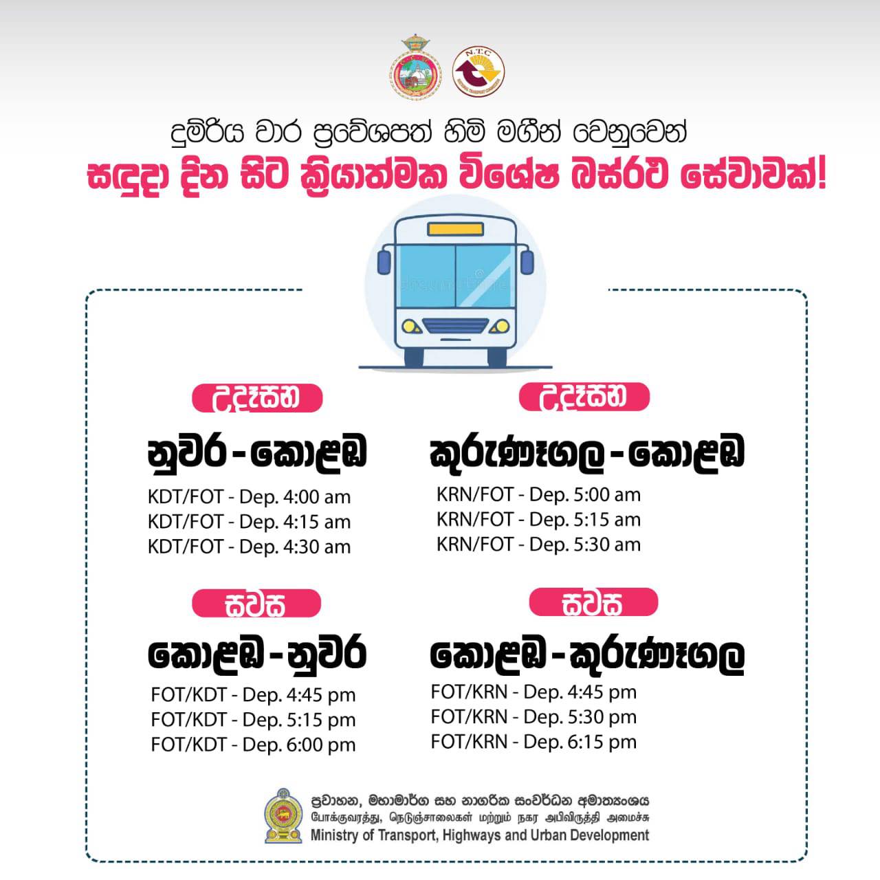 2025 දෙසැම්බර් මාසය සඳහා මහනුවර -කොළඹ සහ කුරුණෑගල - කොළඹ අතර ගමන කිරීම සඳහා රජයේ සේවක හා පුද්ගලික වාර ප්රවේශ පත්ර ලබාගෙන ඇති දුම්රිය මගීන් සඳහා එම දුම්රිය ස්ථාන වලින් ගමන් ආරම්භ කරන පහත කාල සටහනෙහි සඳහන් බස්රිය වලින් ගමන් පහසුව 2025.12.08 දින සිට සලසාගත හැකි බව දන්වා සිටිමු.