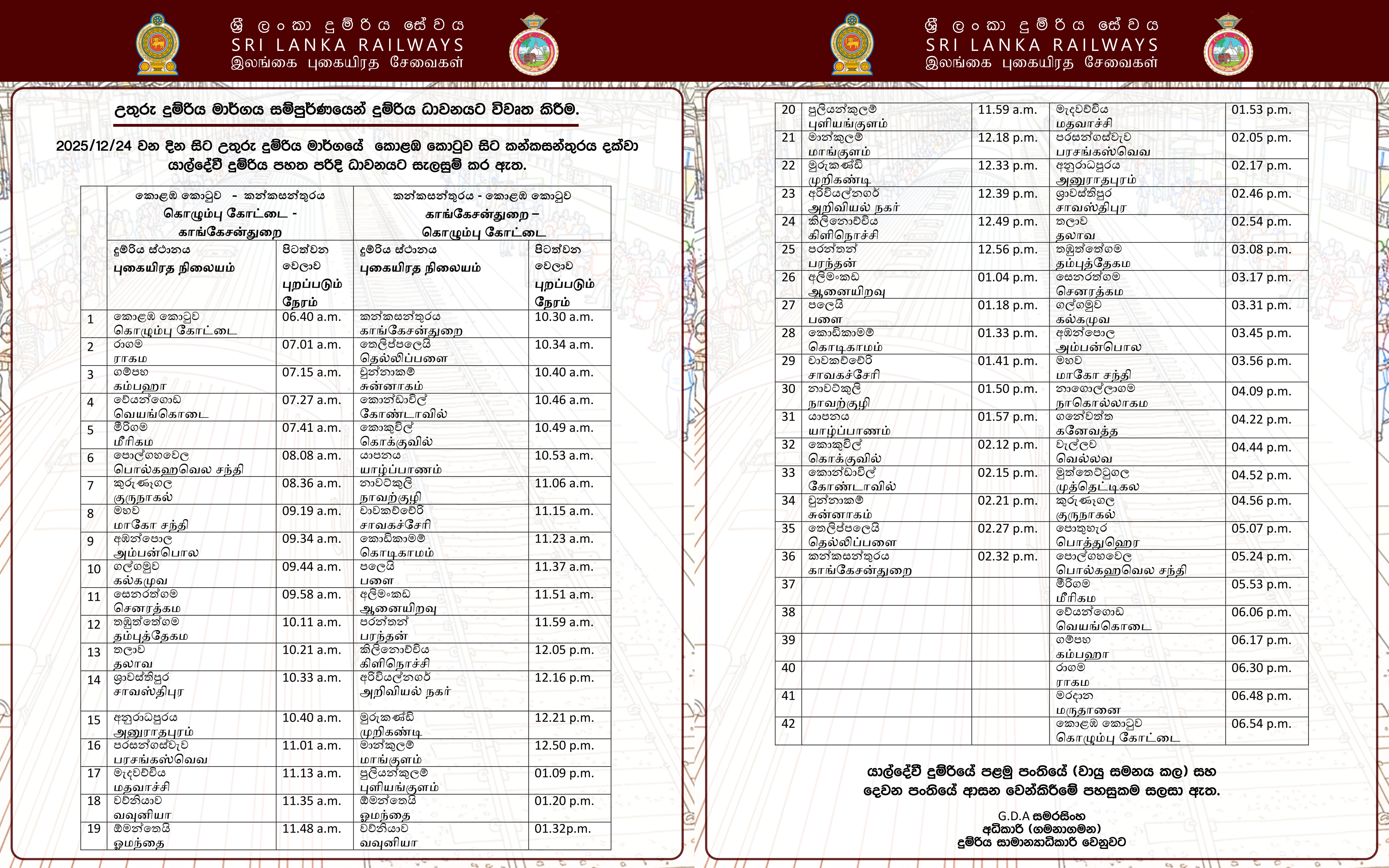 Resumption of train services between Badulla - Ambewela on the Upcountry Railway Line and between Colombo Fort - Trincomalee on the Eastern Railway Line from 20/12/2025.