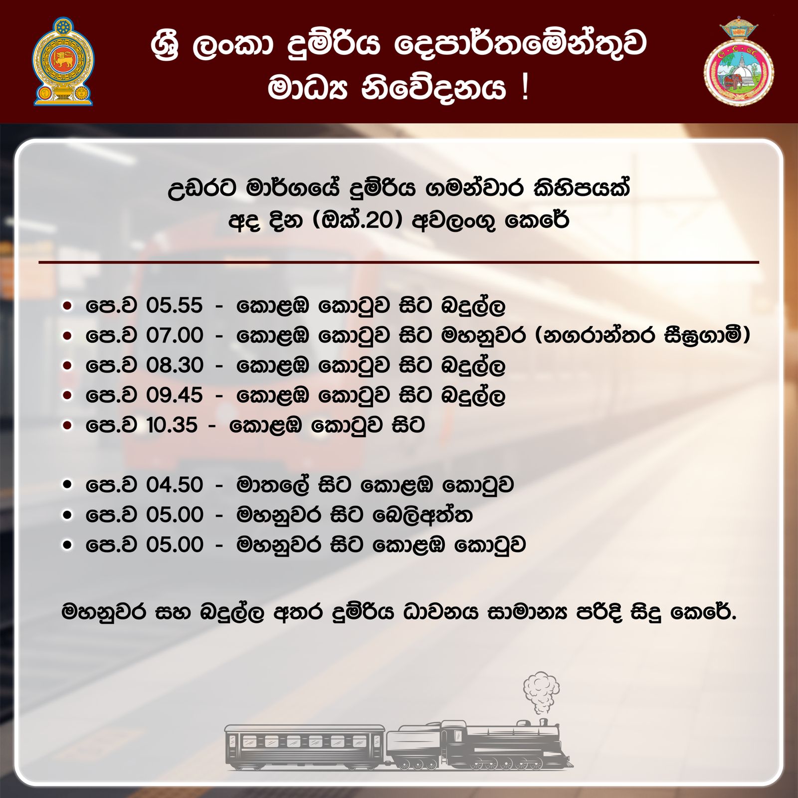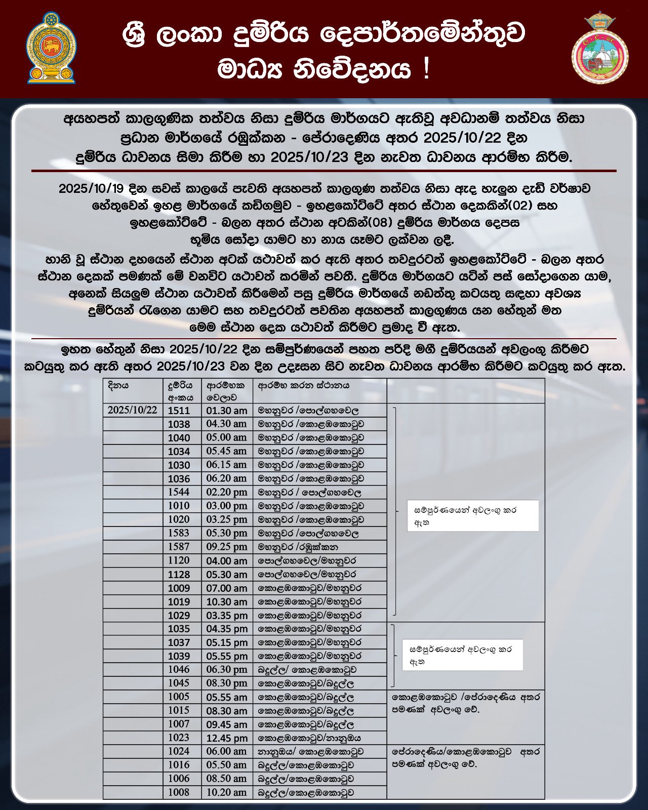 අයපත් කාලගුණික තත්වය හේතුවෙන් රඹුක්කන–පේරාදෙණිය දුම්රිය ධාවනය 2025/10/22 දින නවතා 2025/10/23 දින නැවත ආරම්භ කරන ලදි.