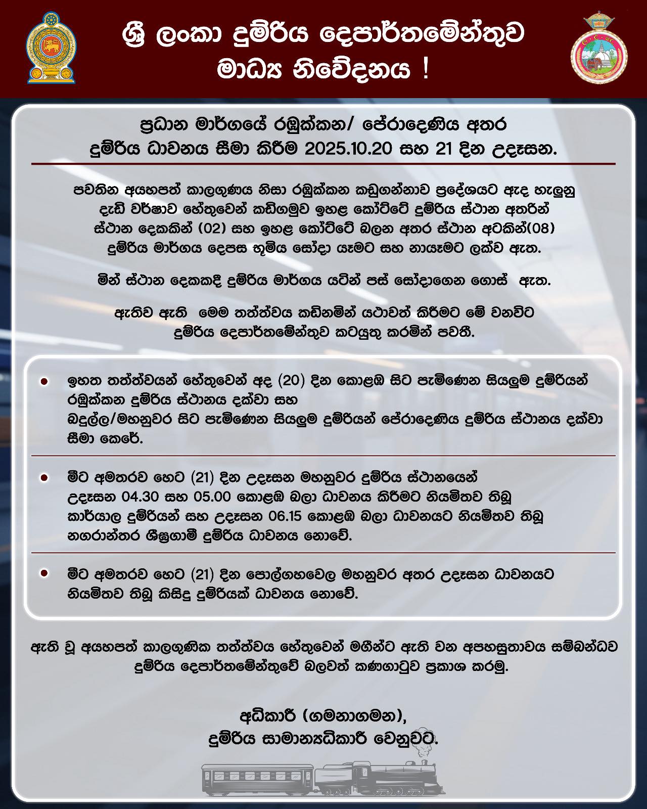 ප්‍රධාන මාර්ගයේ රඹුක්කන/ පේරාදෙණිය අතර දුම්රිය ධාවනය සීමා කිරීම 2025.10.20 සහ 21 දින උදෑසන.
