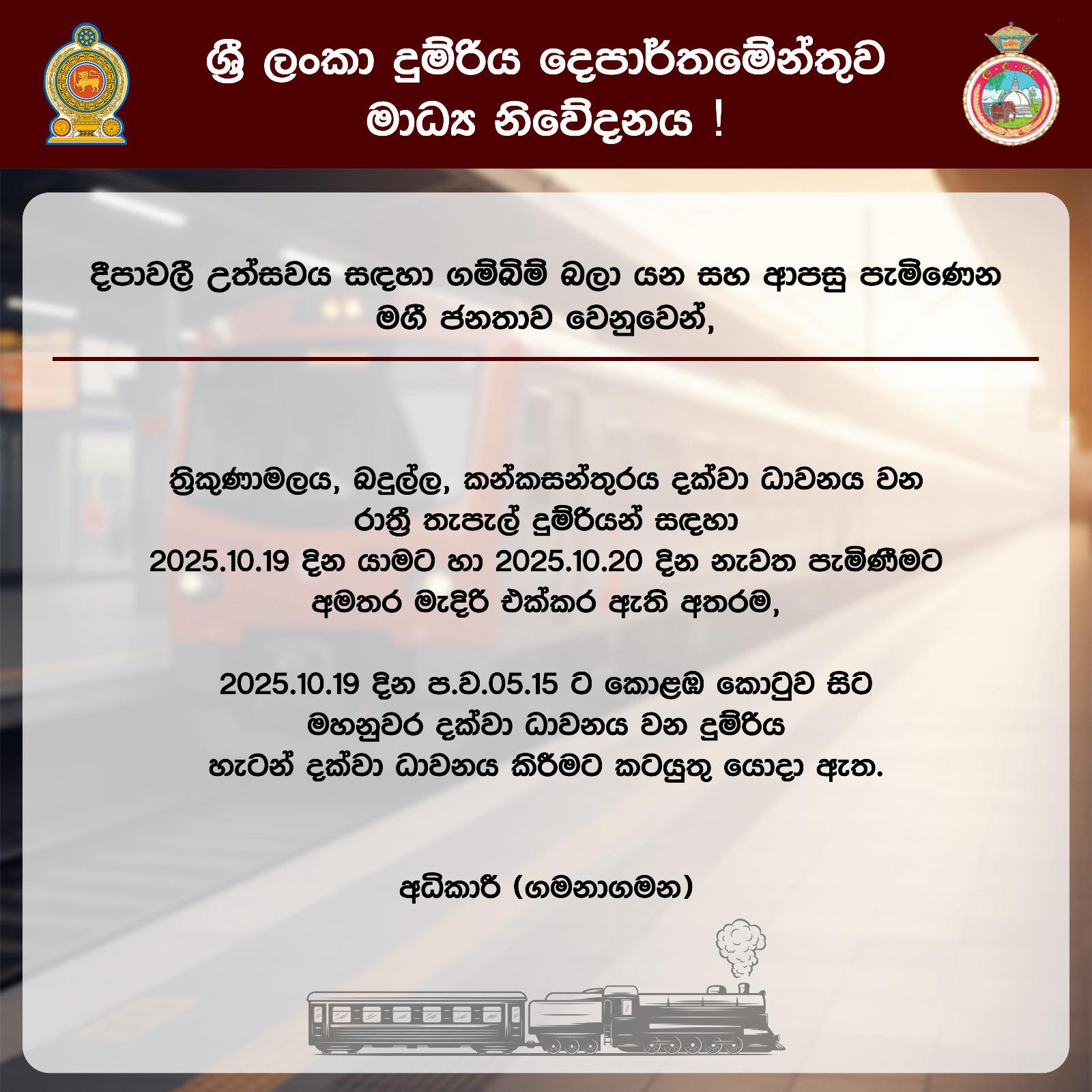 දීපාවලී උත්සවය සඳහා ගම්බිම් බලා යන සහ ආපසු පැමිණෙන මගී ජනතාව වෙනුවෙන්,